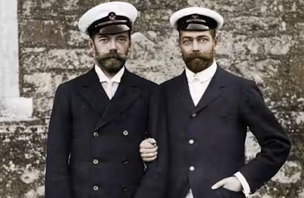 If there was any levity to be found, it came from the doppelgänger cousins themselves. Britain’s King George V (”Georgie”) and Russia’s Tsar Nicholas II (”Nicky”) were first cousins, connected through their mothers, Alexandra of Denmark (Queen Alexandra). and Dagmar of Denmark (Empress Maria Feodorovna)., who were sisters. Georgie and Nicky resembled each other so closely that it’s said they sometimes pranked friends, family members, and even government ministers by swapping uniforms.